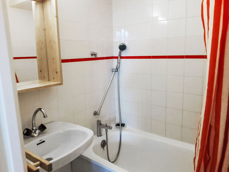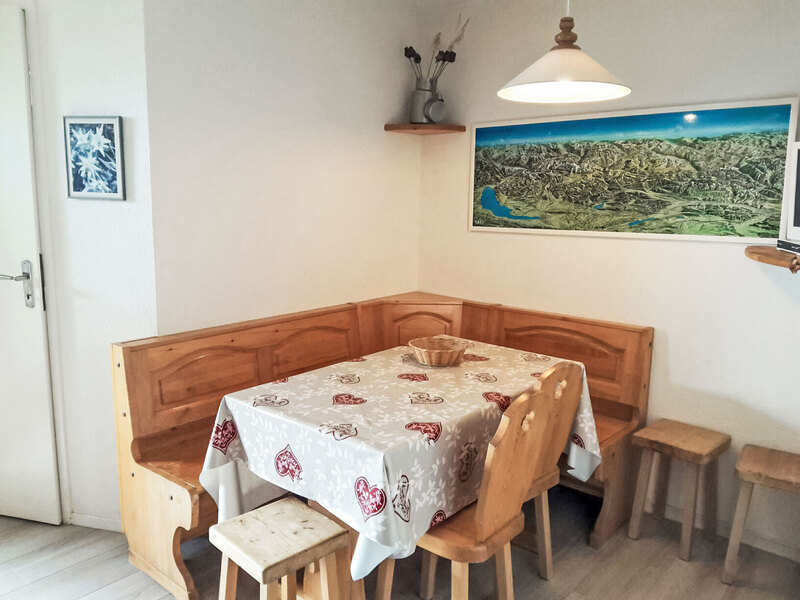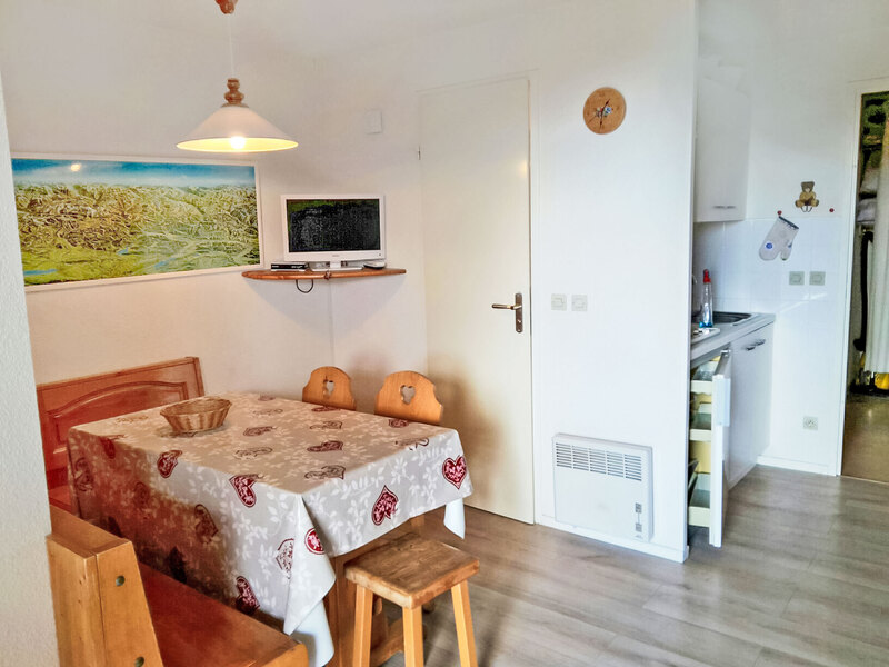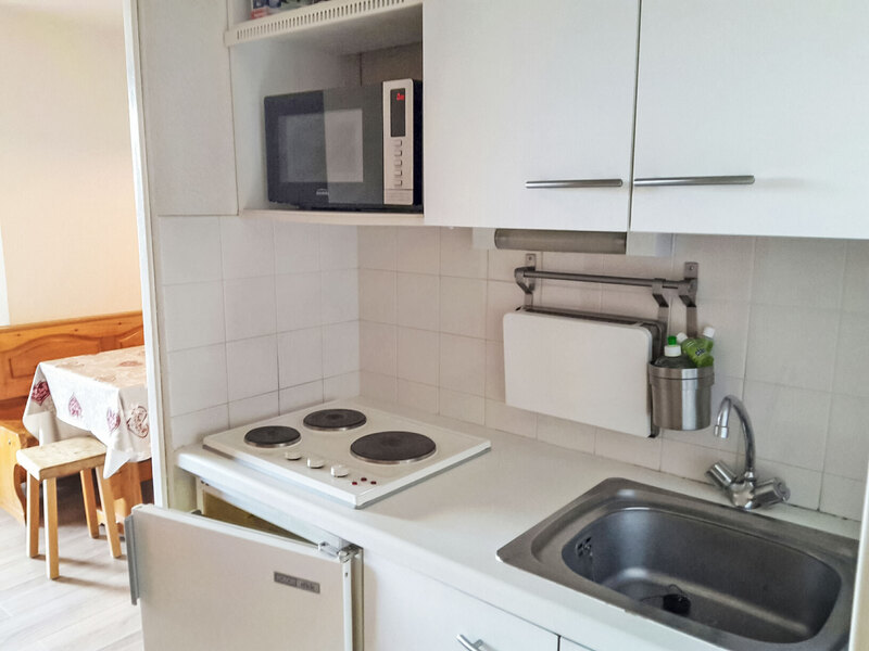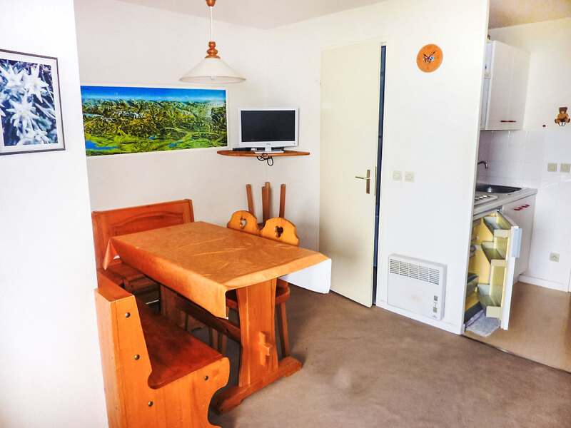 Appartement 2-kamers 28 m2 op de 4e verdieping. Woon-/eetkamer met TV. Hal met 1 x 2 stapelbedden. 1 kamer met 1 2-pers bed. Kookhoek (3-pits kookplaat, magnetron). Badkamer, aparte WC. Balkon, op het zuiden gelegen. Mooi uitzicht op de bergen en de skipiste.