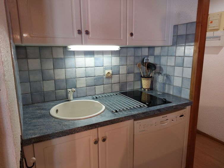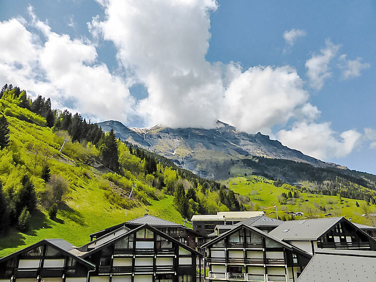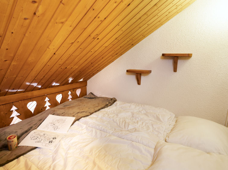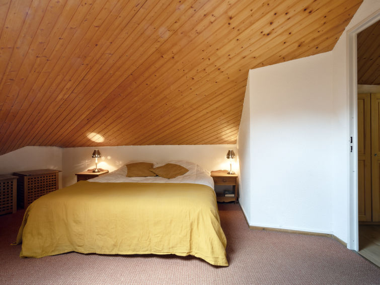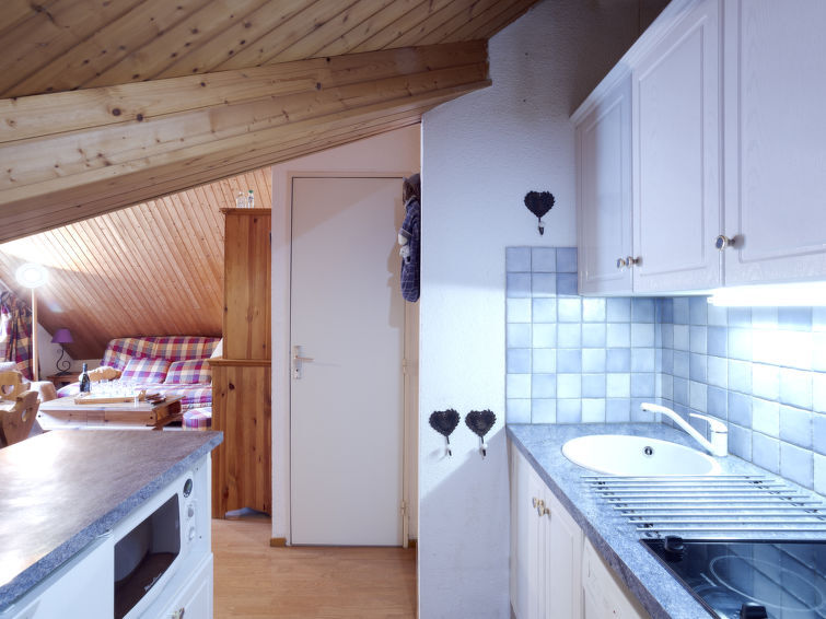 Dakappartement 2-kamers 48 m2 op de 4e verdieping. Afgeschuinde daken, comfortabel ingericht: woon-/eetkamer met TV en radio. 1 kamer met 1 2-pers bed (160 cm). Cabine met 1 2-pers bed. Kookhoek (2-pits kookplaat, afwasmachine, broodrooster, waterkoker, magnetron, grill, elektrische koffiemachine, raclette oven, fondue Set (kaas)) met doorgeefluik. Douche, aparte WC. Elektrische verwarming. Balkon, op het westen gelegen. Ter beschikking: Internet (WiFi, extra). Parkeerplaats nr. 1301 (overdekt). Rookmelders. In plaats van een afgesloten slaapkamer bevinden sommige slaapgedeeltes zich in een open ruimte (galerij, nis, etc.). 74085 000465 KU